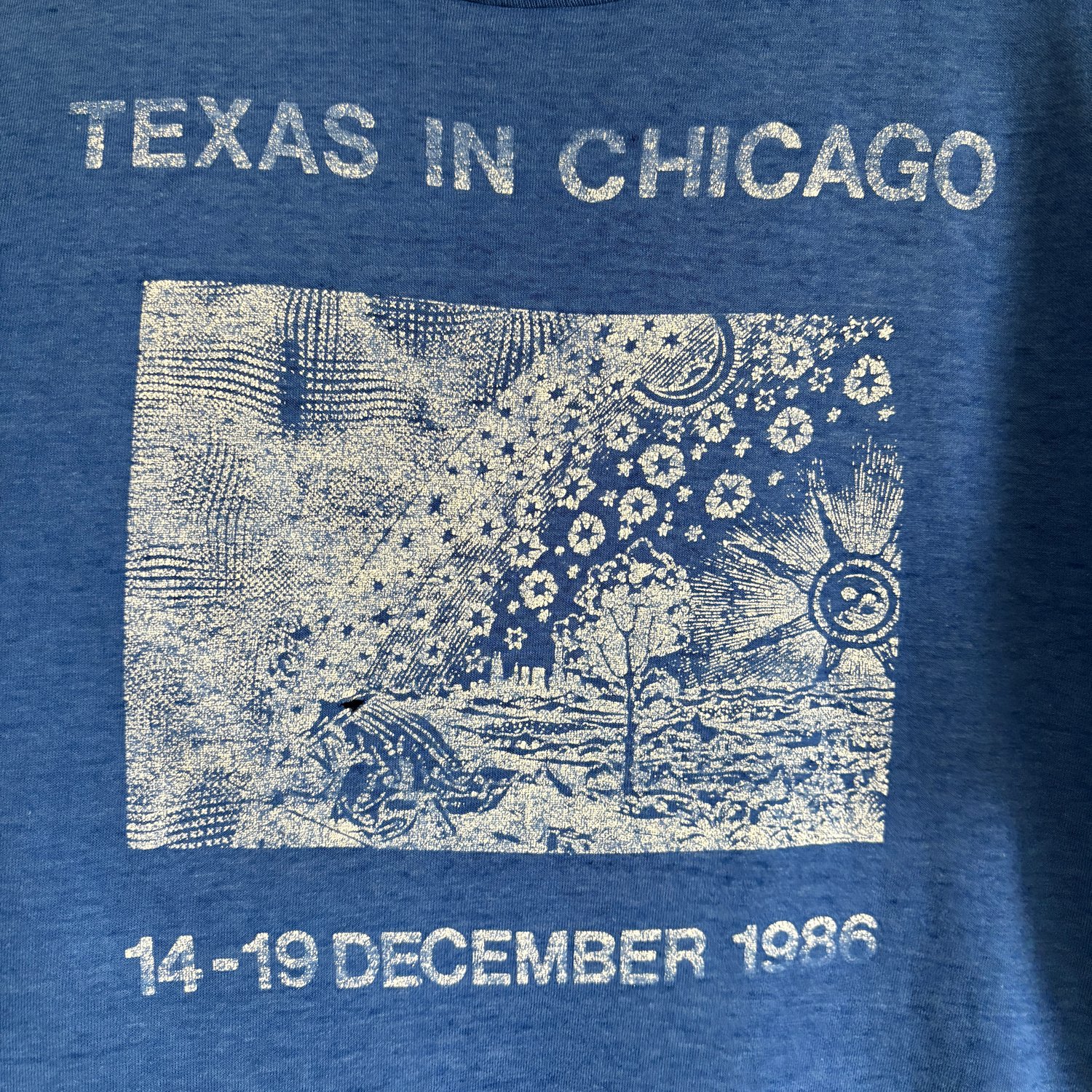 Well Worn Vintage Condition - thin, fading on graphic, a couple tiny holes (see photo)